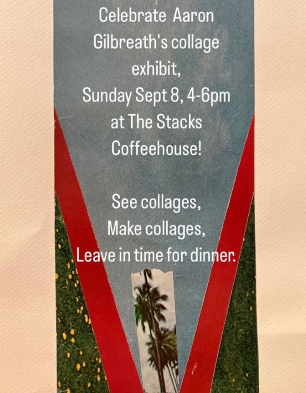 Join us for a special art opening! Celebrate the launch of Aaron Gilbreath’s collages, which will be on display all month at The Stacks, and while you’re here — make some art of your own! The artist will provide materials and supplies, all you need to bring is yourself.